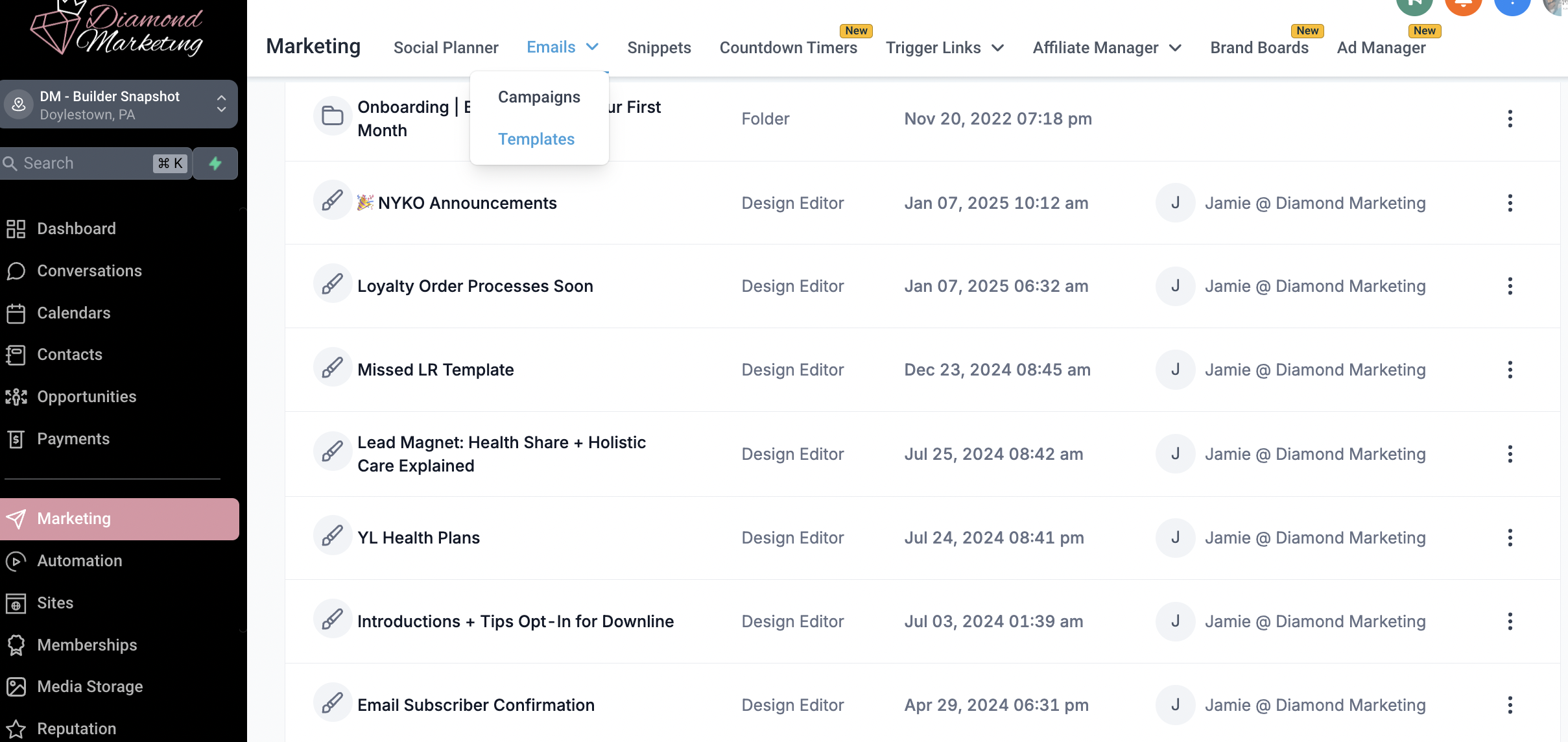 Go to the 'Marketing' Tab: Select 'email' and select 'templates' from the top drop down