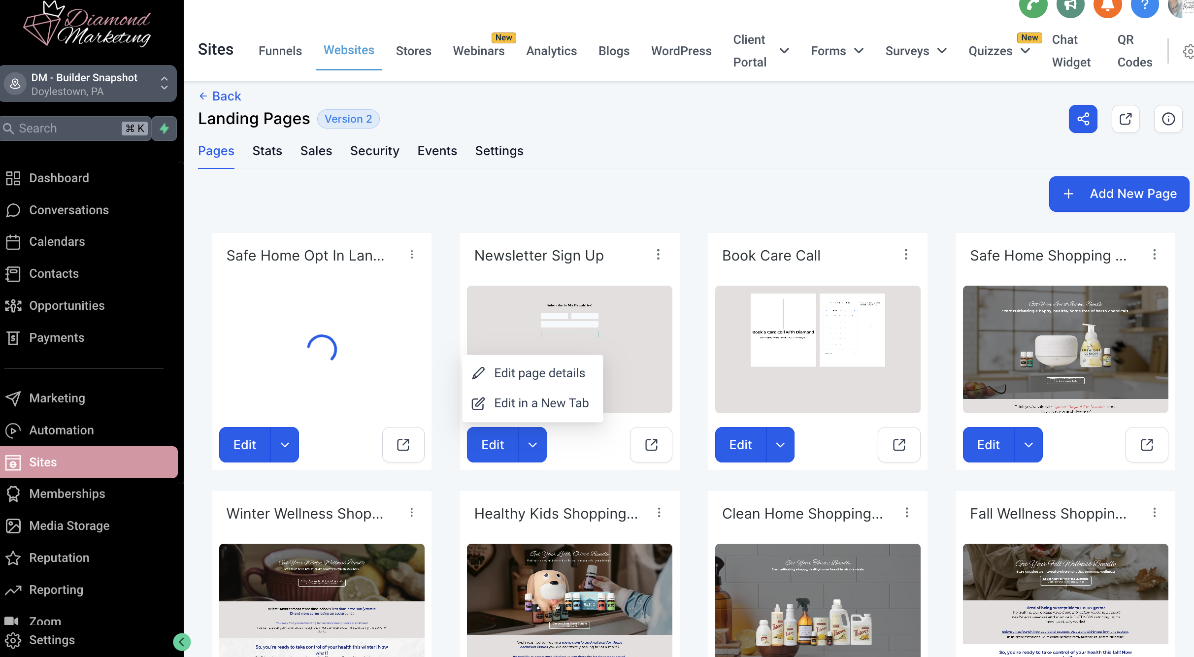 Within the SITES tab, click Websites and then click Landing Pages
